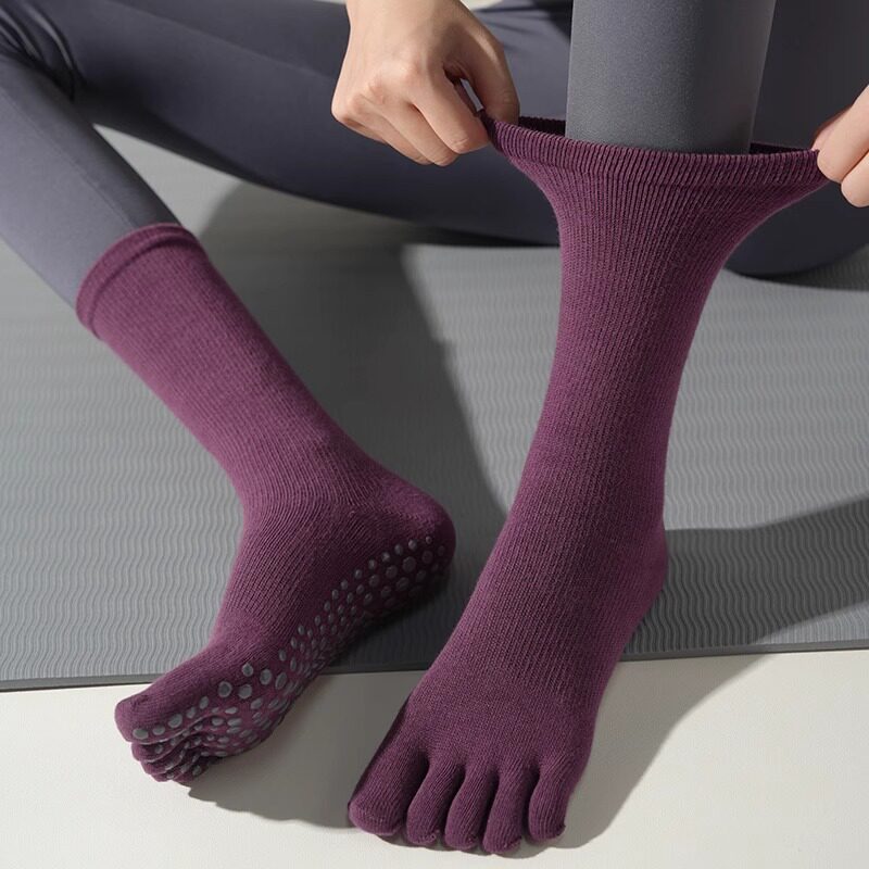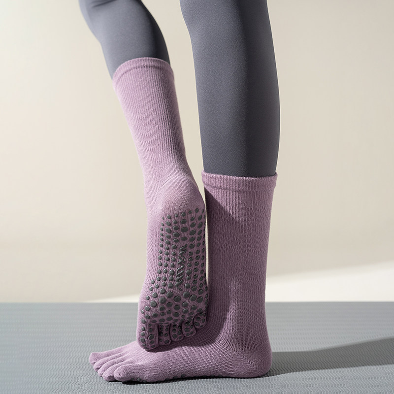 These women’s mid-calf yoga socks are designed for indoor movement routines during cooler seasons. The five-toe, split-toe construction supports natural foot movement while offering stable contact for everyday studio and home practice.
