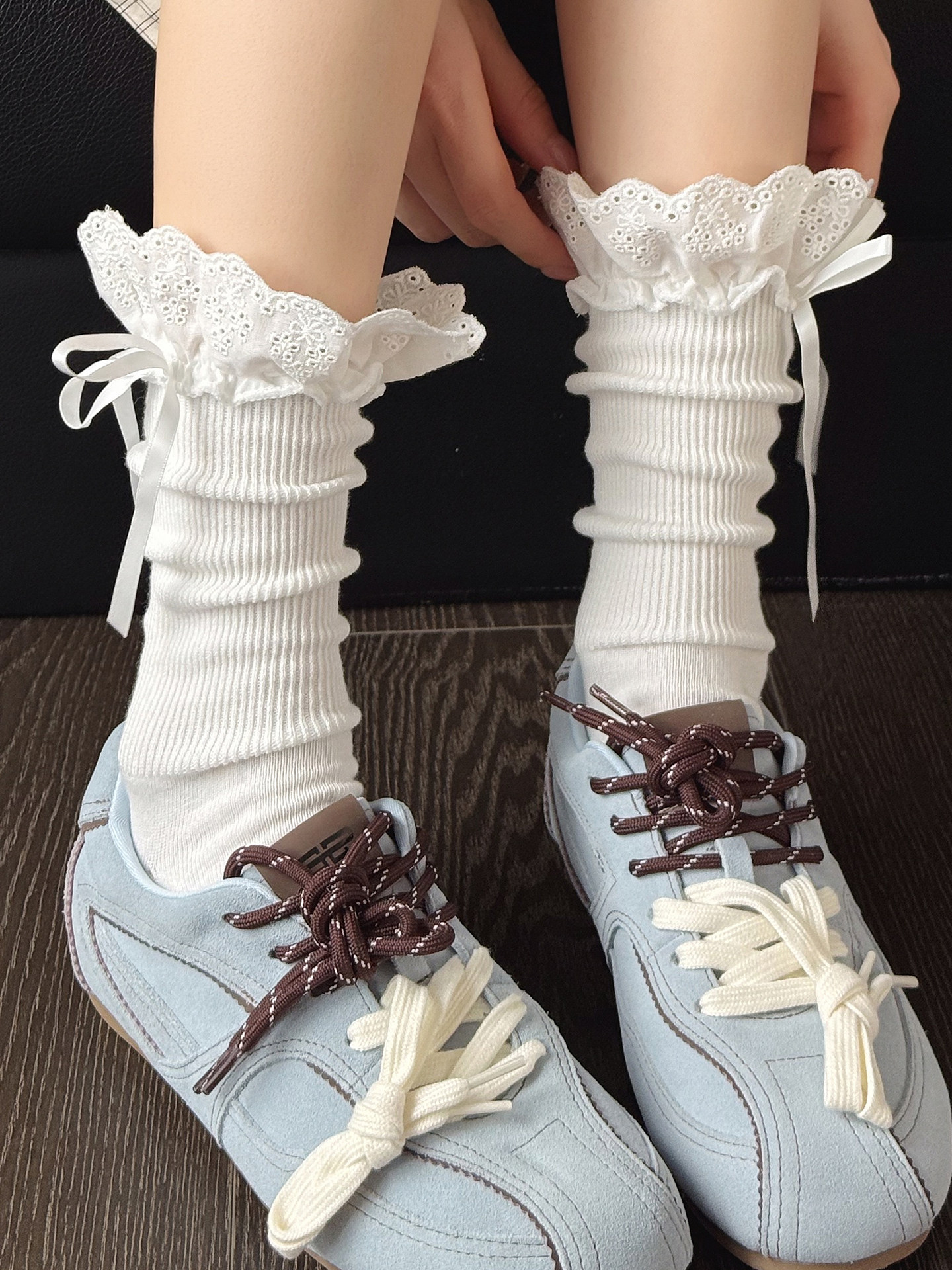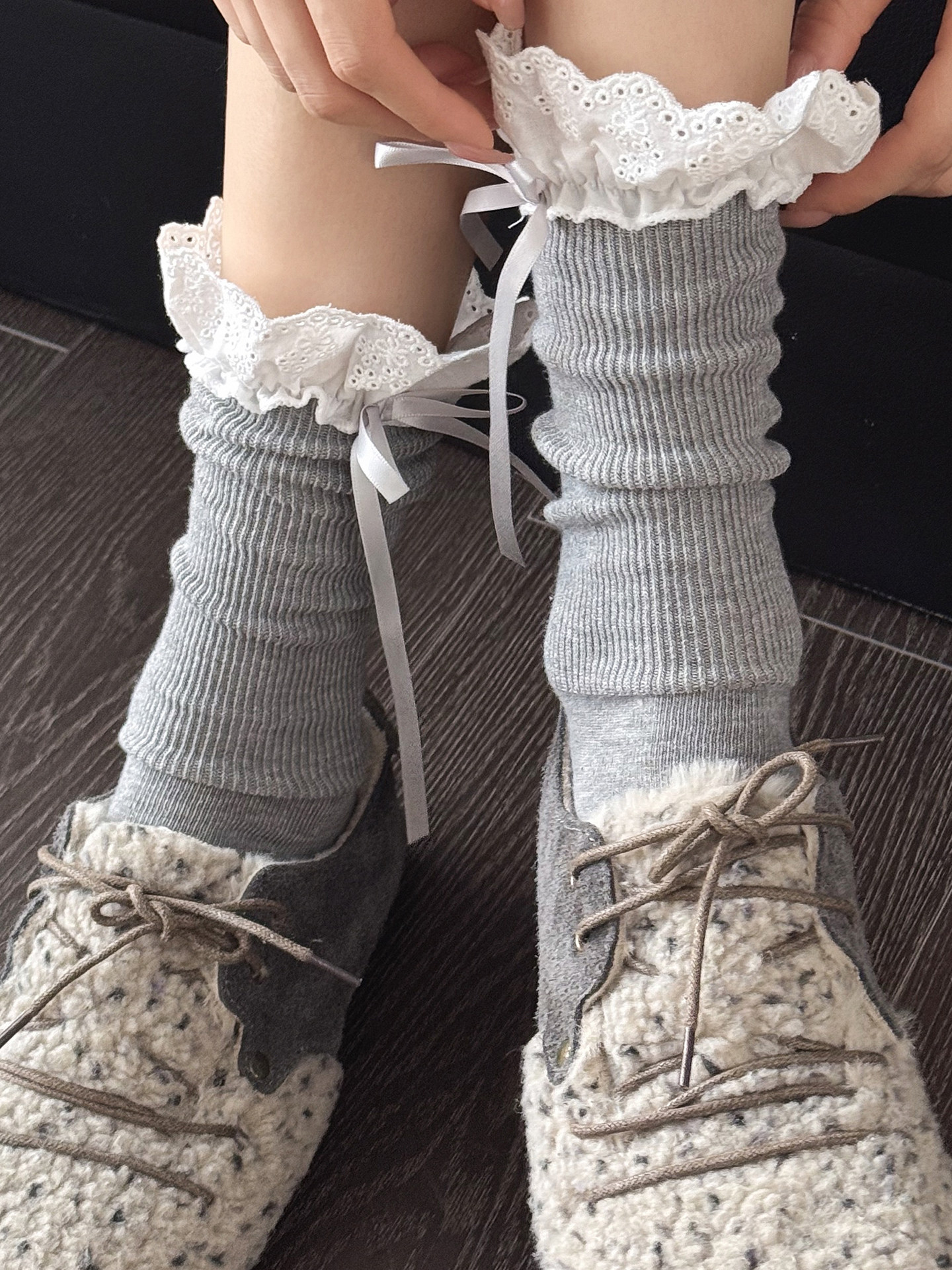 Dcxecsx | Women’s White Mid-Calf Cotton Socks with Lace Trim and Bow Detail, Thick Knit Design for Autumn and Winter Wear
